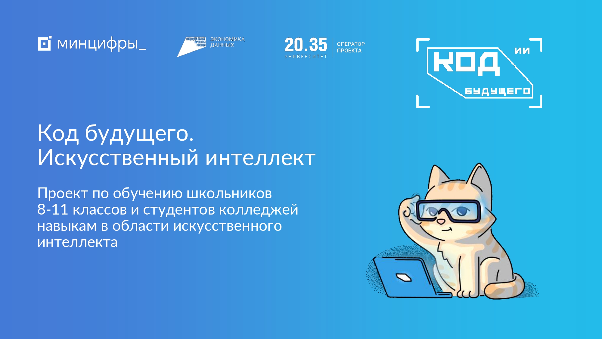 Минцифры России в рамках федерального проекта «Кадры для цифровой трансформации» национального проекта «Экономика данных и цифровая трансформация государства» реализует проект «Код будущего. Искусственный интеллект», направленный на обучение школьников 8–11 классов базовым навыкам в области искусственного интеллекта. Федеральным оператором проекта «Код будущего. Искусственный интеллект» является Автономная некоммерческая организация «Университет Национальной технологической инициативы 2035». В рамках проекта «Код будущего. Искусственный интеллект» слушатели могут освоить курсы объемом 54 академических часа, самостоятельно обучаясь на цифровых образовательных платформах.
